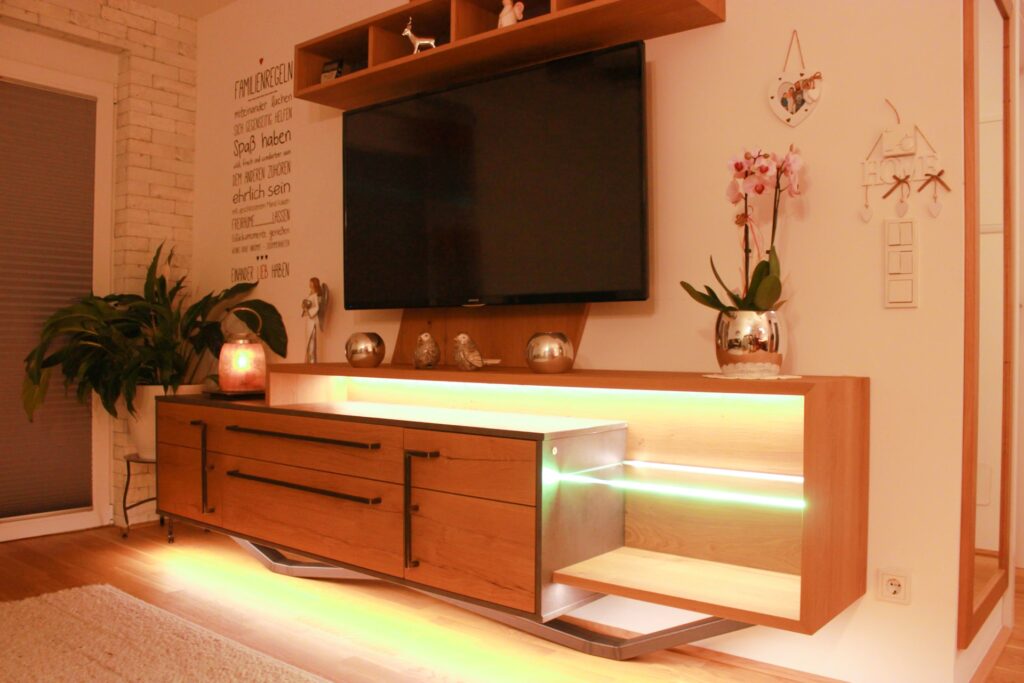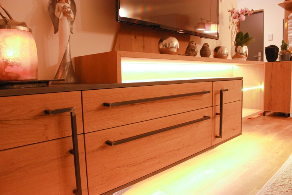 Für ein modernes Zuhause in Jenbach durften wir das komplette Wohnzimmer individuell gestalten – mit einem großen TV-Board samt integrierter LED-Beleuchtung und Glasdetails, das Technik und Design harmonisch verbindet.