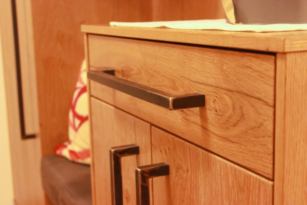 Platzsparende Garderobenlösungen nutzen den vorhandenen Raum optimal aus, während Kommode, Sitzbank mit Tisch und ein Couchtisch aus Holz und Metall nicht nur funktional, sondern auch optisch perfekt abgestimmt sind.